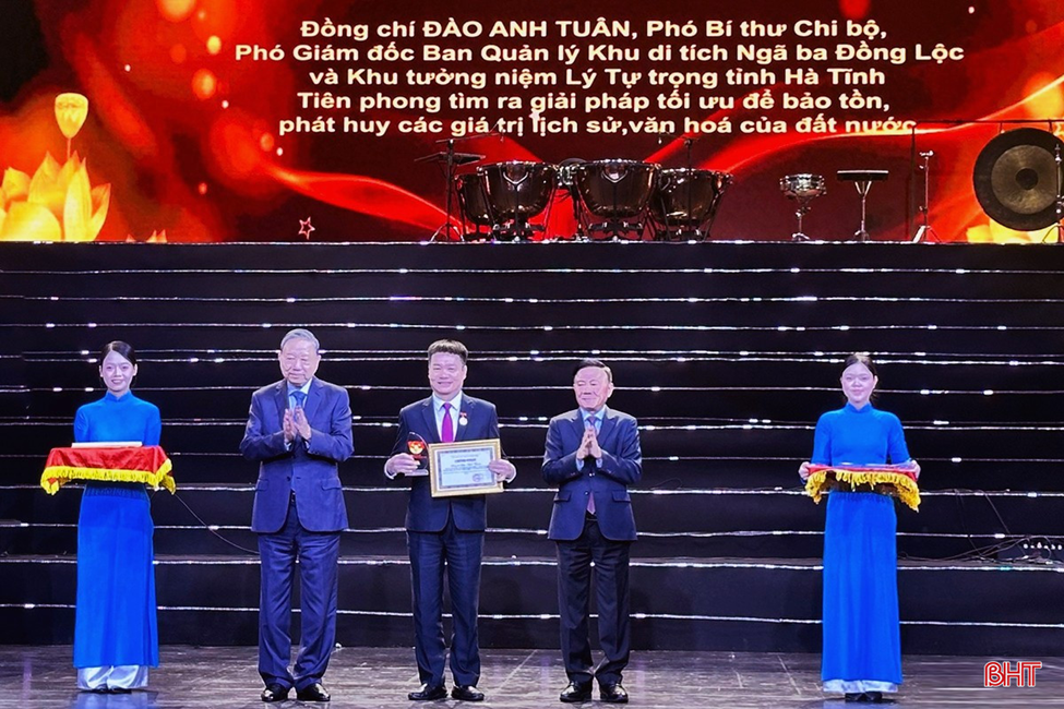 Tổng Bí thư Tô Lâm trao giấy chứng nhận, Thường trực Ban Bí thư Trần Cẩm Tú trao biểu trưng cho đồng chí Đào Anh Tuân - Phó Bí thư Chi bộ, Phó Giám đốc BQL Khu Di tích Ngã ba Đồng Lộc và Khu tưởng niệm Lý Tự Trọng tỉnh Hà Tĩnh là tấm gương điển hình tiêu biểu toàn quốc được vinh danh.