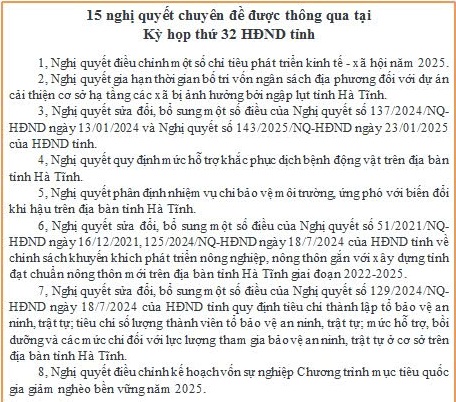 Sau khi thư ký kỳ họp thông qua các dự thảo nghị quyết, các đại biểu HĐND tỉnh đã biểu quyết thông qua 15 nghị quyết chuyên đề về điều chỉnh một số chỉ tiêu phát triển kinh tế - xã hội năm 2025; sửa đổi, bổ sung các nghị quyết về cơ chế, chính sách phát triển nông nghiệp, nông thôn mới; kinh tế tập thể; chính sách dân tộc, an sinh xã hội và bảo vệ môi trường; phân bổ, điều chỉnh kế hoạch vốn thuộc các chương trình mục tiêu quốc gia; công tác tổ chức bộ máy, biên chế và đảm bảo an ninh, trật tự xã hội.