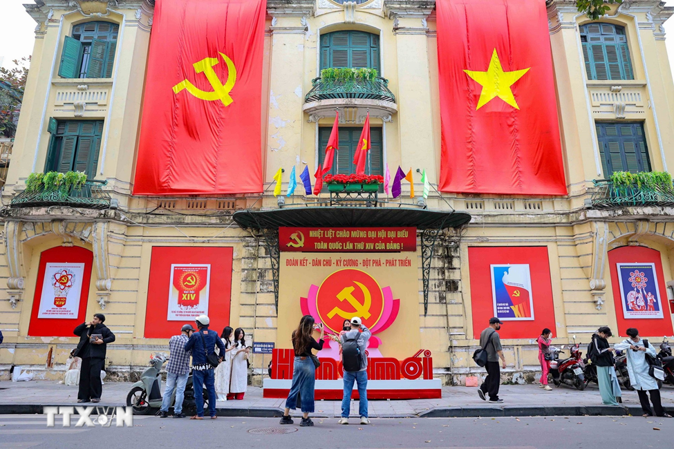 Pano, khẩu hiệu rực đỏ trên các tuyến phố Thủ đô dịp Đại hội đại biểu toàn quốc lần thứ XIV của Đảng. (Ảnh: Lê Đông/TTXVN)