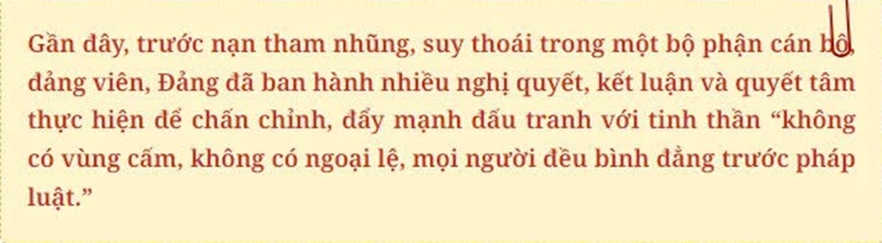Toàn Đảng phải tiếp tục tăng cường xây dựng, chỉnh đốn Đảng một cách quyết liệt, giữ gìn kỷ luật, kỷ cương; nâng cao hơn nữa năng lực lãnh đạo và sức chiến đấu; củng cố mối quan hệ máu thịt với Nhân dân, dựa vào Nhân dân để kiểm soát quyền lực và chỉnh đốn đội ngũ. Đồng thời, toàn hệ thống chính trị phải vào cuộc đồng bộ, phát huy hiệu quả để đưa nghị quyết của Đảng vào cuộc sống; tiếp tục đẩy mạnh phong trào thi đua yêu nước, khơi dậy khát vọng phát triển đất nước phồn vinh, hạnh phúc trong mỗi người dân Việt Nam.